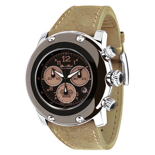- Black dial with black hands, brown arabic numerals and hour markers; Luminous; Black ion-plated stainless steel bezel; Stainless steel crown and pushers with black cabochon
